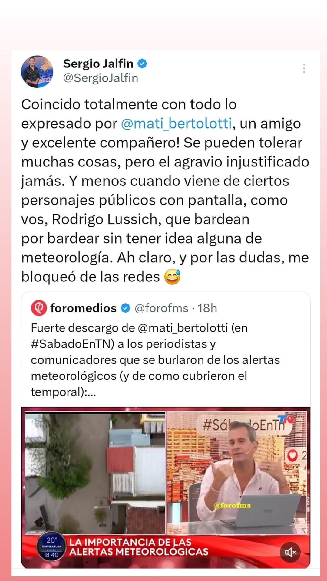 El enojo de Matías Bertolotti surgió tras los dichos de Lussich en Intrusos (América), donde comentó con ironía: “Qué manera de caer agua. Me quejé de que la semana pasada nos engañaron los meteorólogos, pero ahora es un baldazo. Quiero ver muerto a un meteorólogo, que alguien haga justicia”. Además, el conductor calificó de «basura» a Sergio Jalfin, colega de Bertolotti.