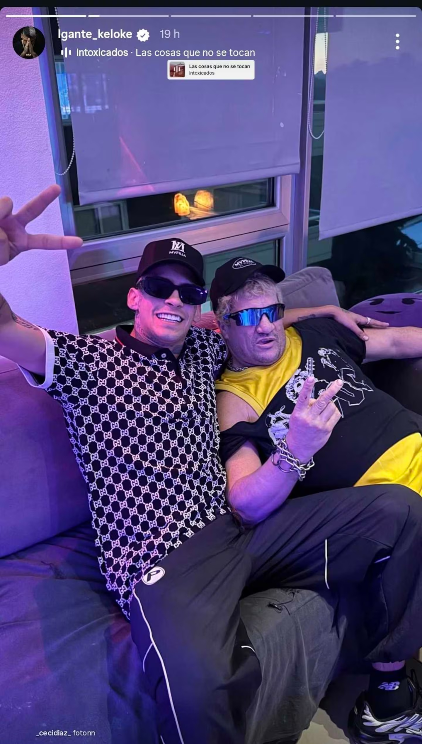 La postal muestra a ambos artistas sentados en un sillón, relajados, con gorras y anteojos de sol, en un ambiente íntimo y distendido. Sin embargo, lo que más llamó la atención no fue solo la imagen, sino el contexto: de fondo suena “Las cosas que no se tocan”, uno de los clásicos de Intoxicados.