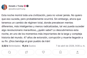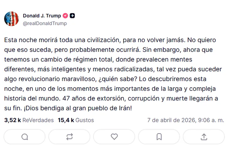 “Esta noche morirá toda una civilización, para no volver jamás”, expresó en redes sociales. La frase, por su crudeza, generó impacto inmediato. Pero más allá del contenido, lo que encendió las alarmas fue el tono. Un tono que mezcla amenaza, incertidumbre y una extraña épica, como si el destino de millones de personas pudiera narrarse como parte de un guion.