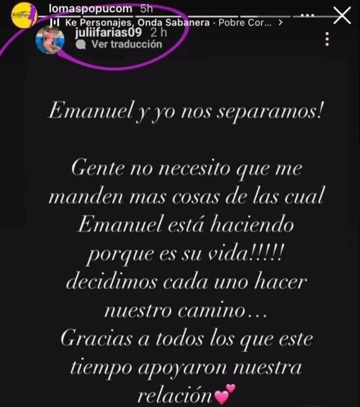 Estas palabras generaron especulaciones sobre una posible separación, y posteriormente, Julieta Farías, la ex prometida de Emanuel Noir, confirmó la noticia de la separación en su cuenta de Instagram. Aclaró que ambos habían decidido tomar caminos separados y agradeció a quienes los habían apoyado durante su relación.