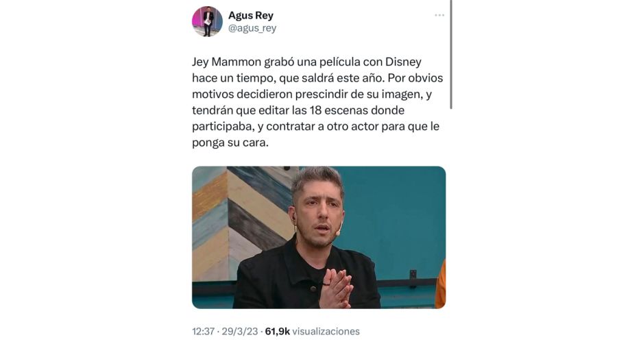 La compañía estadounidense informó que eliminará su actuación tras la polémica en la cual está envuelto. «Jey Mammon grabó una película con Disney hace un tiempo, que tiene como fecha de estreno este año. Ahora, decidieron prescindir de su imagen, y tendrán que editar las 18 escenas donde participaba, y contratar a otro actor», escribió el periodista Agustín Rey.