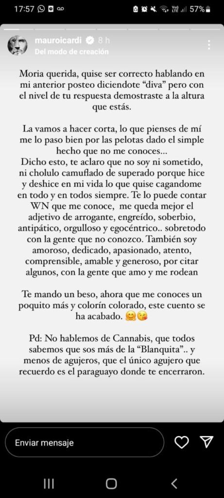 La one continuó y soltó: “Limitado botinero Mauro, me impresiona mi fama y cómo te movilizaron mis pavadas. Lo cual me hace pensar que padecés de una desabastecimiento neuronal al no tener humor. Como no me conocés, te aviso que yo sublimo por el humor. Así que paso a decirte que sigo pensando que sos un cholulo camuflado de superado, sometido, pollerudo, marido de la otra, desclasado entre tus pares, que te detestan. Mediocre deportista y me estoy enterando, porque me llaman periodistas para decirme que fuiste convocado tres veces por la Selección Argentina, que no te pudiste instalar debido a tu bajo rendimiento”.