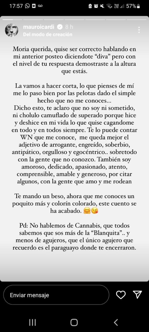 La one continuó y soltó: “Limitado botinero Mauro, me impresiona mi fama y cómo te movilizaron mis pavadas. Lo cual me hace pensar que padecés de una desabastecimiento neuronal al no tener humor. Como no me conocés, te aviso que yo sublimo por el humor. Así que paso a decirte que sigo pensando que sos un cholulo camuflado de superado, sometido, pollerudo, marido de la otra, desclasado entre tus pares, que te detestan. Mediocre deportista y me estoy enterando, porque me llaman periodistas para decirme que fuiste convocado tres veces por la Selección Argentina, que no te pudiste instalar debido a tu bajo rendimiento”.