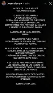 El conflicto surgió cuando trascendió el proyecto de concesión número 3399406, que indica que la marca “La Nena de Argentina” —frase que identifica a María Becerra en su música, su merchandising y sus redes— está registrada a nombre de José Levy hasta 2033.