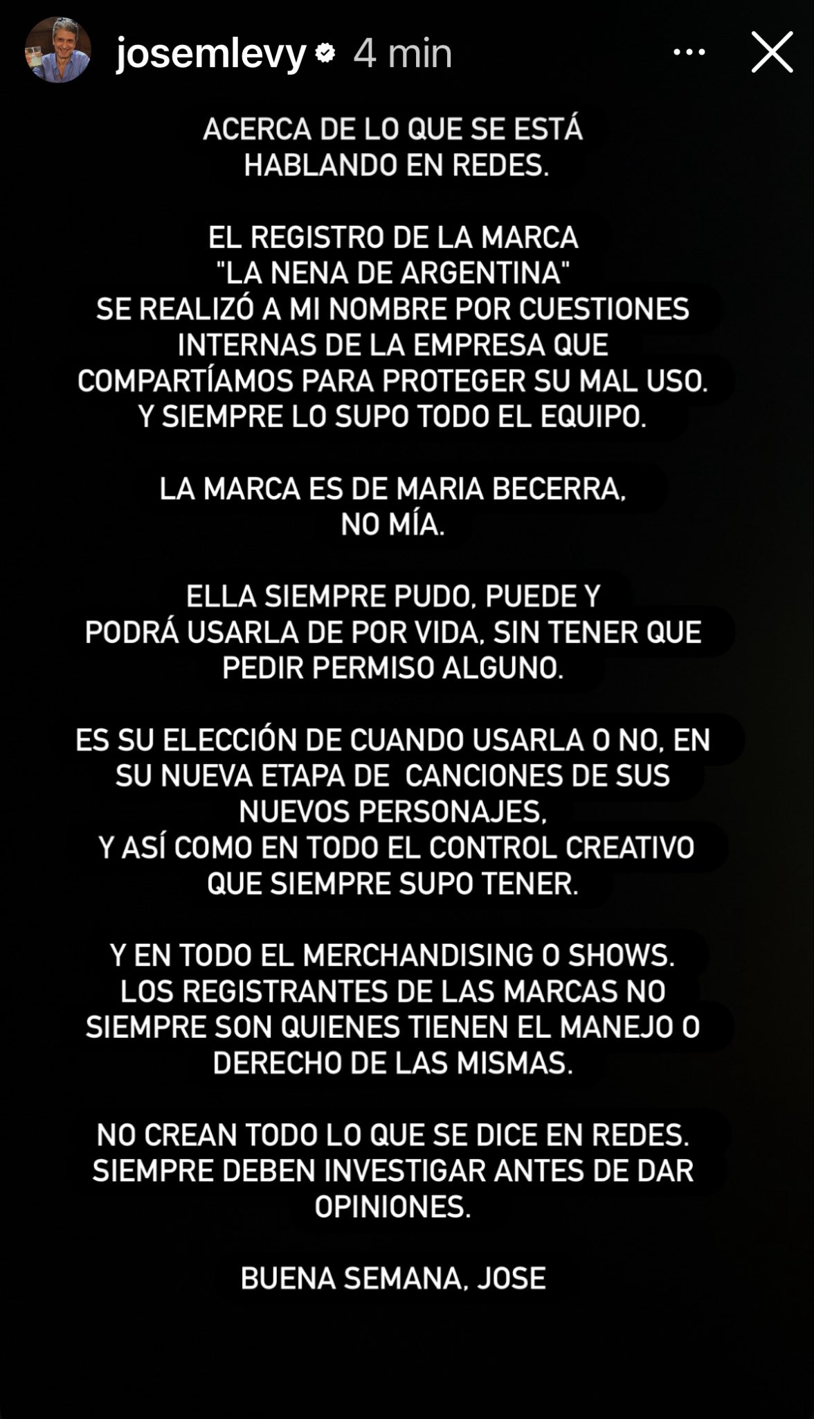 “El registro de ‘La Nena de Argentina’ se realizó a mi nombre por cuestiones internas de la empresa que compartíamos y para proteger su mal uso. Y siempre lo supo todo el equipo”, explicó Levy.
