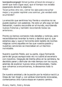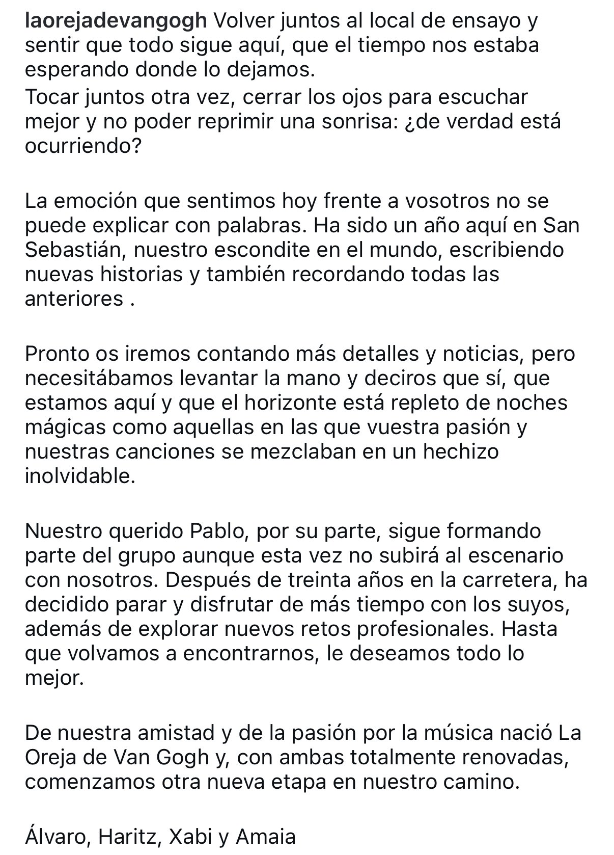 El comunicado de La Oreja de Van Gogh deja entrever que este reencuentro podría tener un carácter especial, incluso nostálgico. “Ha sido un año aquí en San Sebastián, nuestro escondite en el mundo, escribiendo nuevas historias y también recordando todas las anteriores”, expresaron.