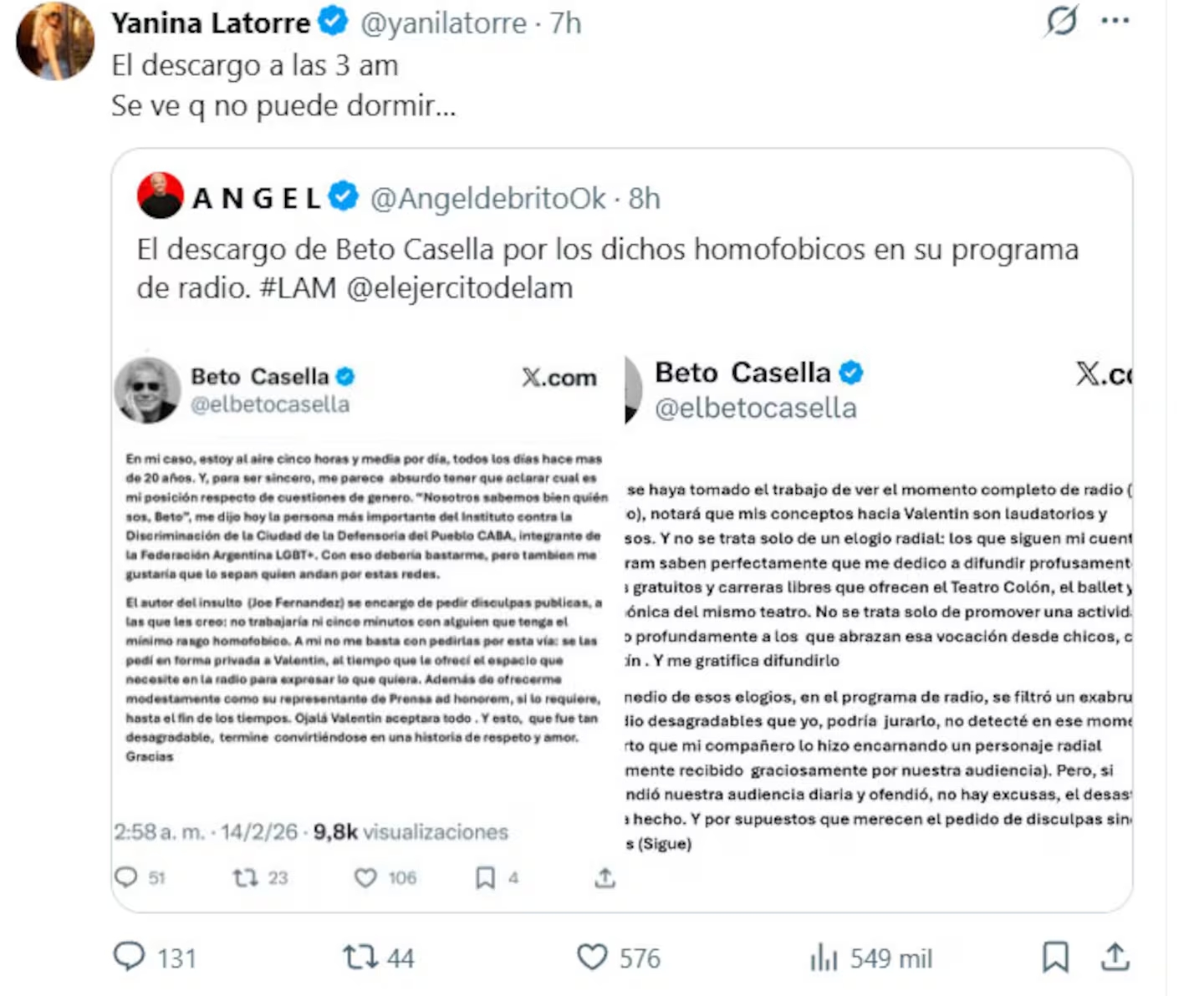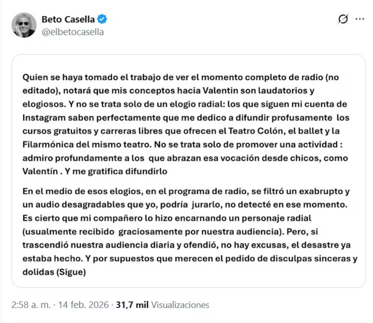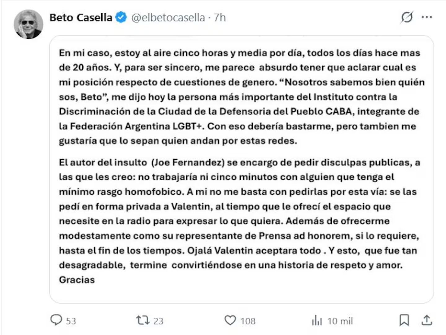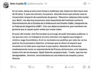 Todo comenzó con el escándalo por los comentarios homofóbicos lanzados en radio contra Valentín Fresno, integrante del Teatro Colón. La polémica creció, hubo pedido de disculpas público y parecía que el tema bajaba la espuma. Pero no. A las 3 de la mañana, un posteo en X reavivó el fuego.